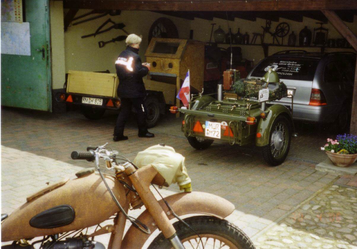 In der Zeit als die Steaks und Bratkartoffeln noch in der Pfanne brutzelten zeigte uns Specki seine umfangreiche Sammlung von Armee- und Polizeiuniformen sowie interessanter technischer Gegenstände. Richtig begeistert waren wir aber von der Präsentation der von ihm selbst aufgebauten russischen Motorräder. Die Idee zum Aufbau einer viersitzigen Molotov fanden wir dabei ganz kurios. Nach dieser Stippvisite stand für uns fest, dass wir noch mal für einen längeren Besuch vorbei schauen werden.