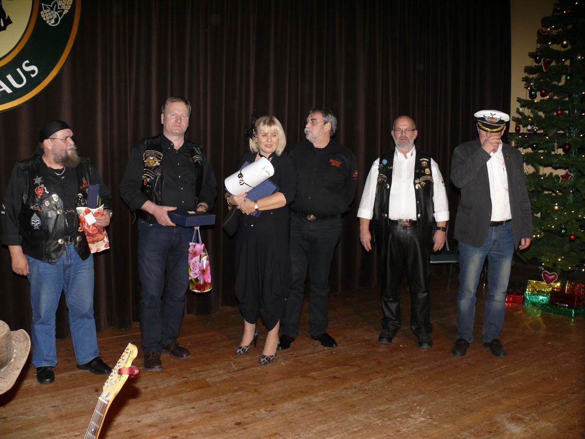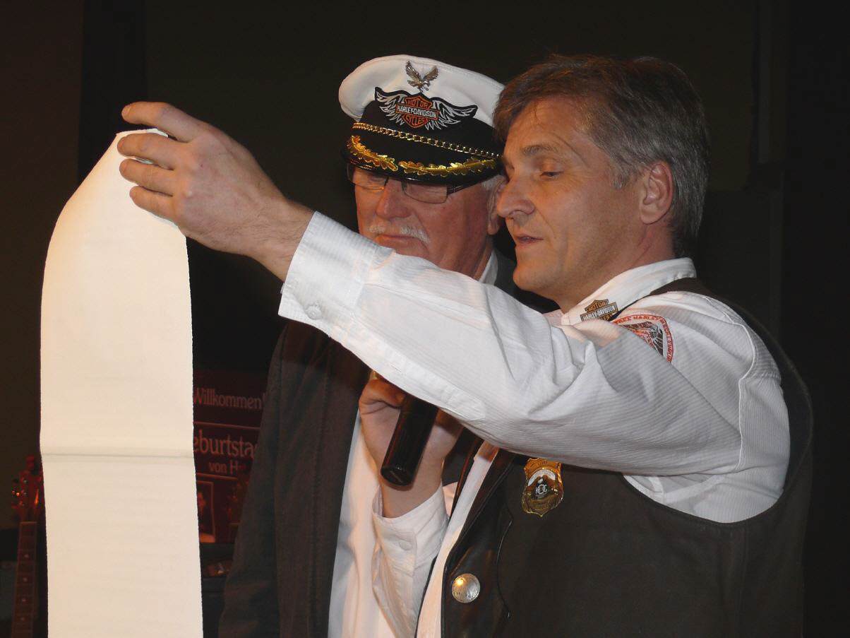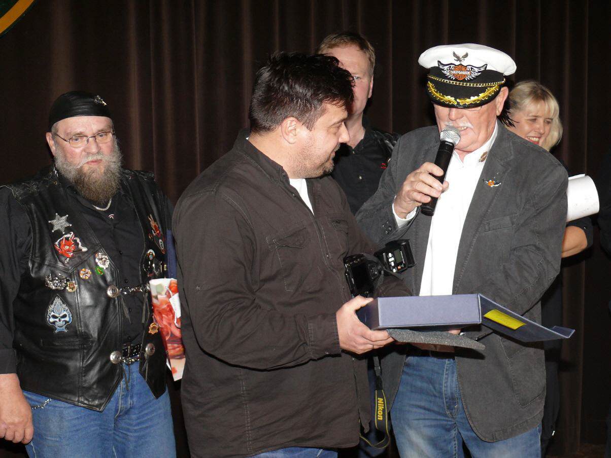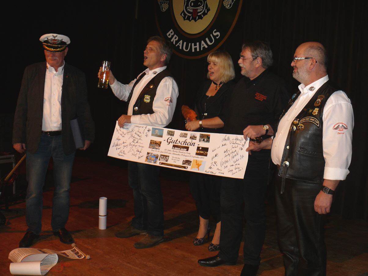 Die Member des Free Harley Mecklenburg Chapter bedankten sich bei Hans für sein langjähriges, engagiertes und erfolgreiches Wirken als Director des Chapter und überreichten ihm neben den vielen Glückwünschen und Präsenten einen Gutschein zur Teilnahme an einer der Partys zum 110-jährigen Jubiläum von Harley-Davidson in Milwaukee bzw. Rom.